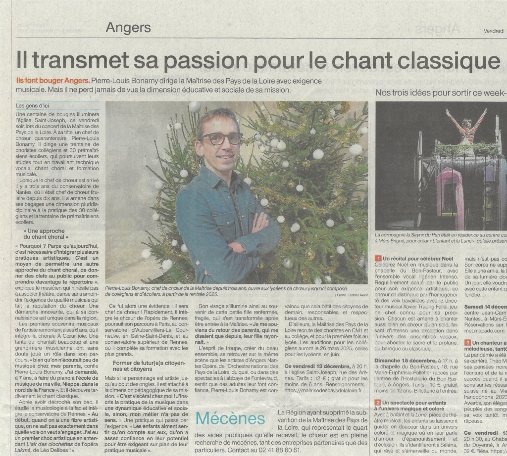 Dimanche 22 septembre 2023, notre directeur musical Pierre-Louis Bonamy était l’invité de RCF Anjou pour l’émission Culture Magazine. Il est revenu sur l’année 2022-2023 de la Maîtrise et a présenté la saison 2023-2024. C’est une saison qui s’annonce très riche et variée !