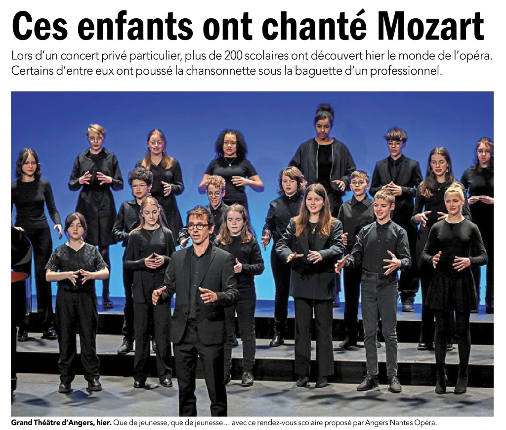 Le mardi 4 mars, la Maîtrise des Pays de la Loire était sur la scène du Grand Théâtre d’Angers avec Angers Nantes Opéra pour le spectacle participatif Ça va mieux en le chantant – Les Enfants de Mozart pour deux représentations : une à destination des scolaires et une tout public.